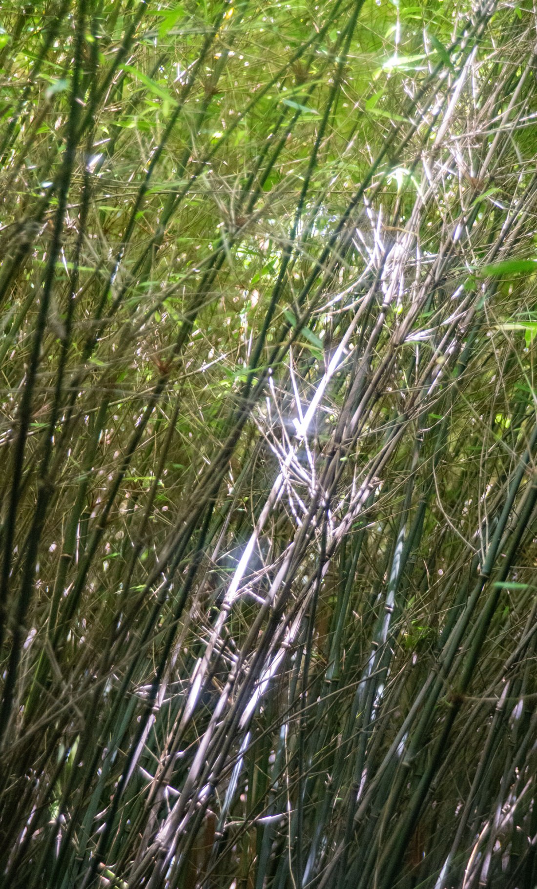 My photo is of bamboo- which can be VERY destructive if it gets its roots deep enough- and my eye was fixated by the one highlighted strip. The intensity of the light overexposed this strip: the camera couldn’t handle the contrast, so all the colour has bleached out leaving stems and leaves a silvery white. If you look closely, you can see some of these parts glow as they reflect glare which made the lens “flare.”