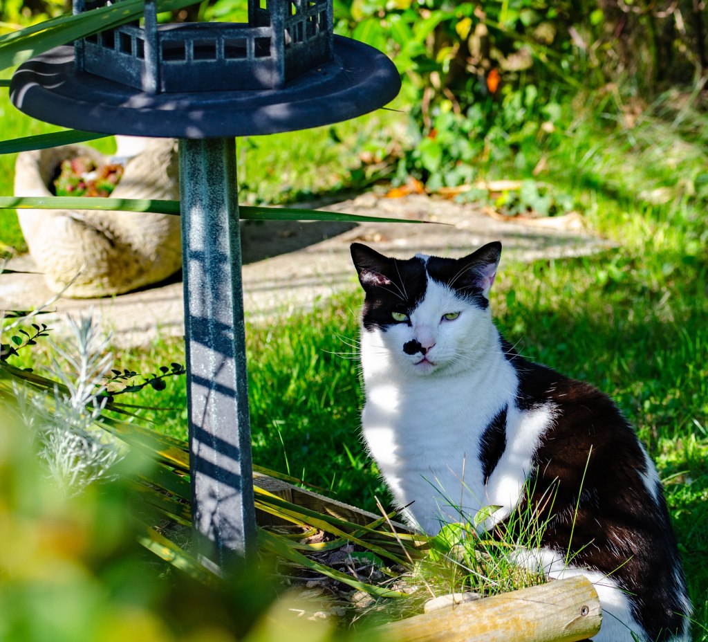 This isn’t our cat. We don’t have one. We do, however, feed the birds in our garden. The cat’s owners, living nearby, provide very well for the black-and-white panther. He (the cat, not the owner) is sometimes friendly, but often looks down on us as tenant-farmers who should supply livestock on demand. You know, mice are acceptable, and I once witnessed a thrilling safari onsite featuring a young magpie (who barely escaped).