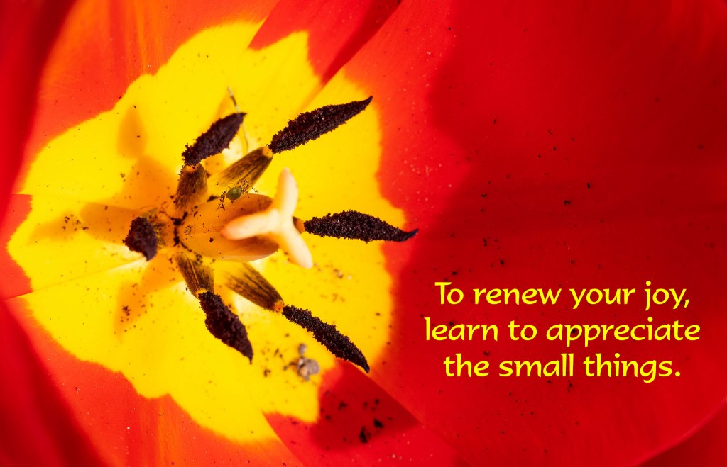 When we need to renew the sense of joy, the experience of lightness of spirit and being at peace in our world, a great way to start is to pay attention to the small things, the details, the abundance of life all round us. Attention given leads to awareness, appreciation, and a deep gratitude for the richness that is here.