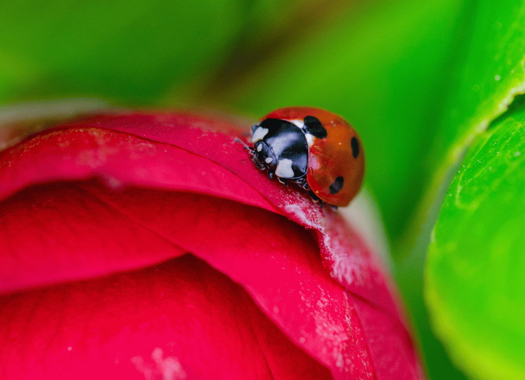 A day of surprises too. Pardon the colour clash between the camellia and the ladybird: all is forgiven because of the sterling work the bugs do. Hidden away in hibernation until now, they are popping up all over- I’ve been trying to “spot” them… (Sorry! Couldn’t resist the joke.)