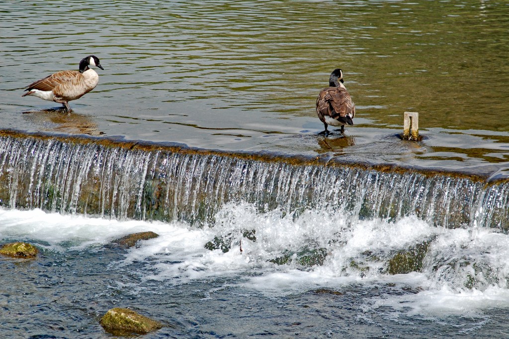 Watching the river water cascade down the step is fascinating. Every now and again a duck will use the weir as a “down escalator” by lifting its webbed feet and sliding on the current and over the edge. I never saw any geese trying the same trick- but who knows?