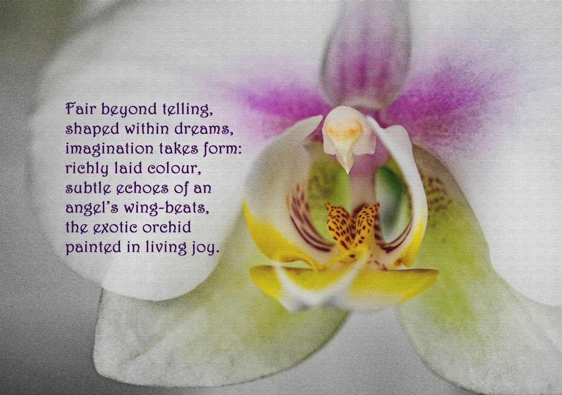 Then the display of orchids on my windowsill changed the way I perceived the day. A white one with yellow and pink; yellow and purple with two sprays of blooms; and the purple and white-spotted one. Immediately, my mind shifted gear: and I wrote a few lines trying to capture in words what I was feeling. The shape and colour fascinated and inspired heart and soul: such exotic beauty lifted my spirits and restored joy to life. So, go find a flower!