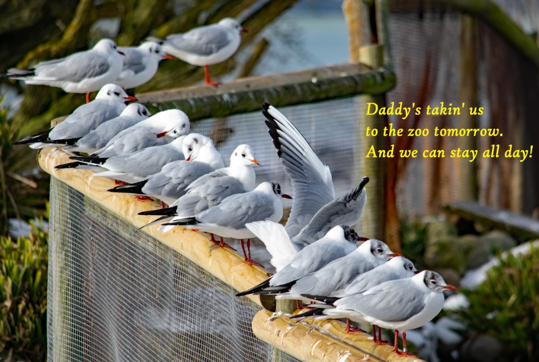 These young seagulls reminded me of the song as they clustered together on the fencing of the penguin pool at Whipsnade. Lined up in an orderly fashion, watching the penguins play. Just as noisy as a school trip on an outing!