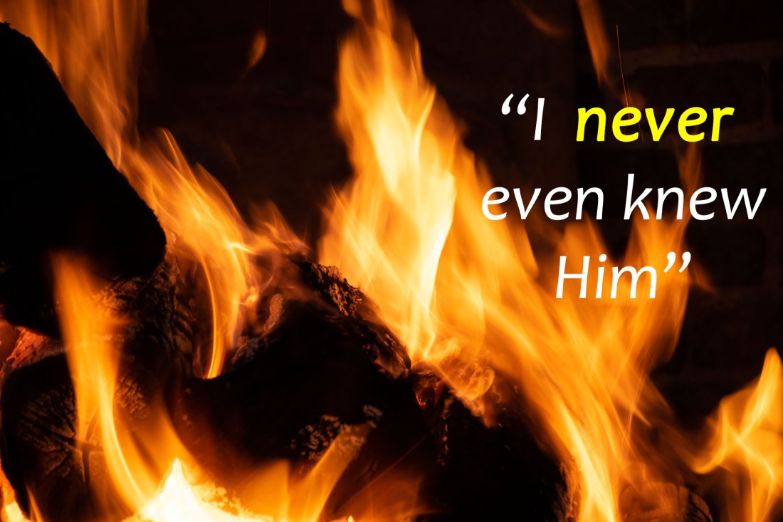 Peter, now in a cold sweat. So much happening, a cold garden, noisy soldiers, a slashing sword, and Jesus led away… “What are they doing to Him in there? I can’t go until I know… perhaps they’ll let Jesus go after all. Hot fire. I’ll just wait here. No, I don’t want to talk, just shut up. Leave me to my thoughts. Jesus? Did I hear His name? They’re talking about Him – Who me? NO, not me. Yes, the accent gives me away, I’m Galilean. No, I don’t know him. Will you just shut UP… For heaven’s sake… I never EVER knew Jesus!”